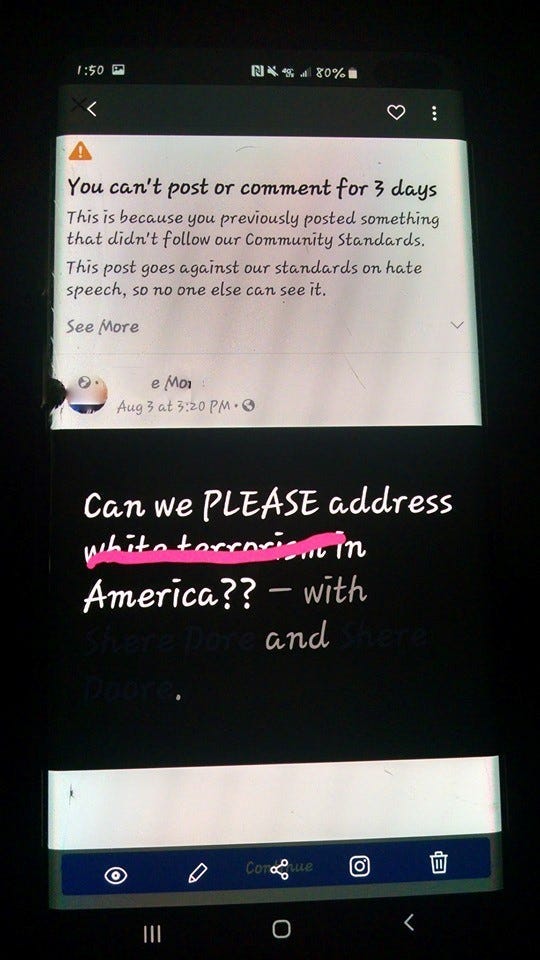 It’s become obvious that we must rely on phone trees, and old fashioned email lists to organize, because Facebook has a white supremacy problem. Not only does its algorithms suck the posting of our events into a black hole. It limits us to a handful of invites, thus further diminishing our ability to publicize important events, unless we pay their exuberant advertising fees. We are having important voices in our community face bans for calling out White Supremacy and Toxic masculinity. Any attempt to use those combination of words, leads to a ban.