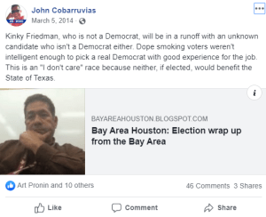 But no. Here is John, again criticizing others. This time he is being vindictive and rude towards other Democratic voters, because he disagreed with their pick for candidate. It’s one thing to list out why a candidate is problematic, it is quite another to brand anyone that disagrees with his beliefs as “dope smoking voters”. John talks about the need to fall in line for the sake of party unity, but apparently that unity only works one way. His way. FYI, studies have shown that if Texas would legalize marijuana, we would be able to avoid the budgetary disaster that the COVID-19 pandemic is causing. The economic benefit to Texas for legalization of marijuana has been addressed for years.