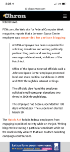 John is a well known member of the party. Dare I say he is infamous for his voracious blogging habits. While I probably agree with John on many items, where I differ from him is with his approach. While I’m no stranger to speaking out, and perhaps making enemies, I try to stick to the facts, and I try to keep from being an outright bully. The violation of the Hatch Act above could simply be written off as passion.