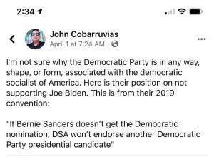 This year John tried to push through a change to the party rules to ensure that DSA members and other progressive members would be disenfranchised and booted out of the party. He claims that it is because they won’t support another Democratic Party Presidential candidate. I was a Bernie supporter in the 2016 primary and voted for Hillary during the general. I again supported Warren and Sanders this year, but I am currently serving as Biden delegate to the state convention. I brought this up, because John has a history of poking this “divide” as an excuse to silence progressives.