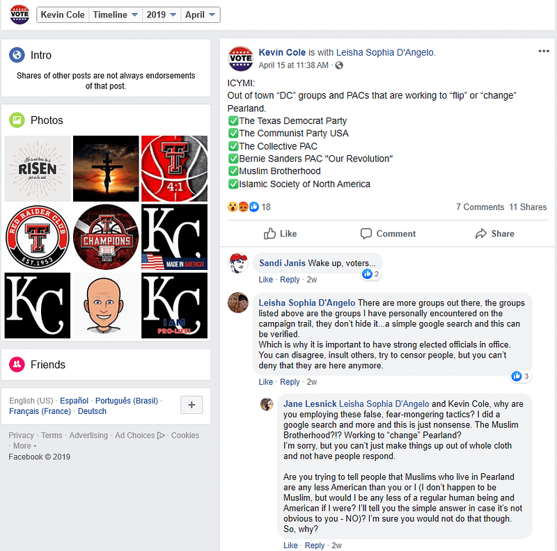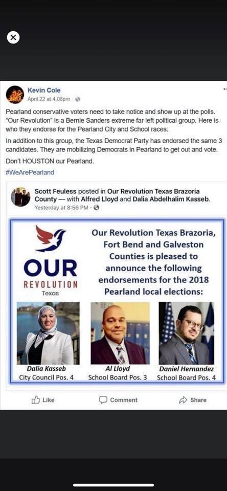 So while you can’t wear Racist language on your clothing, you are free to express those views and hold office in Pearland. Former City Council member Kevin Cole, and Current City Council Member Woody Owens are proud of the language they use online. Kevin Cole is currently running for Mayor in Pearland.