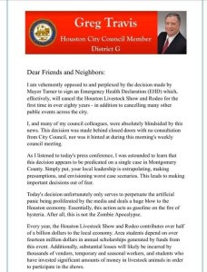 Greg Travis and KTRH radio are working hard to politicize and issue that should be common sense. The world is facing a pandemic, and the most vulnerable populations will suffer greatly if they ignore the advice of actual experts, while listening to the verbal vomit coming from those that are motivated only by what the stock market drop means for their bottom line. The COVID-19 virus will affect everyone regardless of political affiliation, and it’s important to get ahead of this and work proactively instead of reactively.